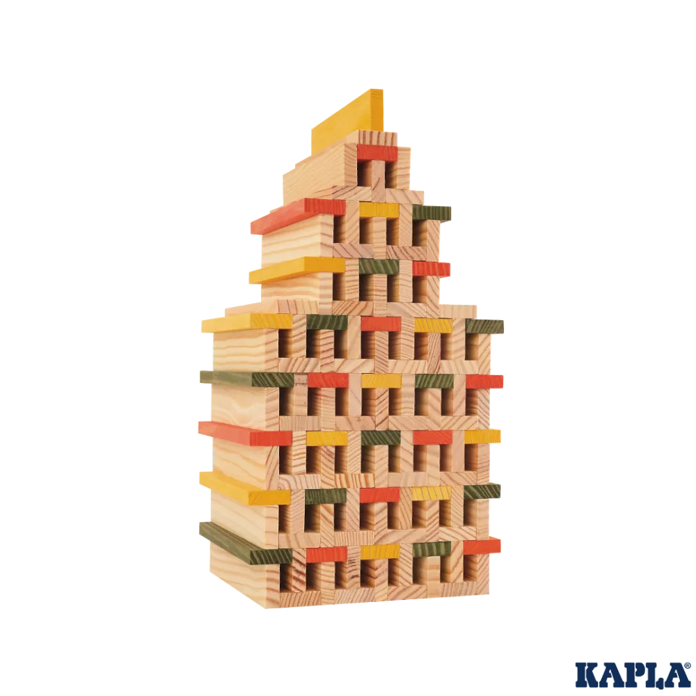 Die KAPLA-Plättchen sind aus naturbelassenem, nachhaltigem Pinienholz (Seekiefer) gefertigt, das aus französischen, zu 100% nachhaltig bewirtschafteten Wäldern stammt. Die farbigen Holzplättchen sind mit lebensmittelechter Farbe gefärbt.