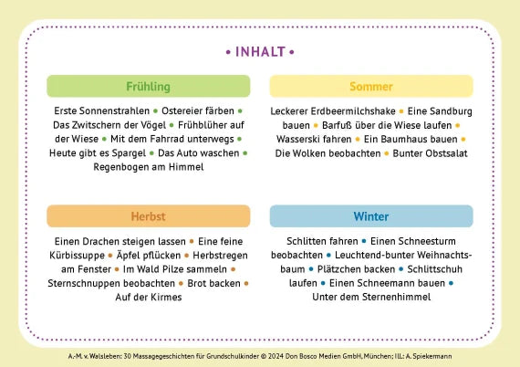 „Erste Sonnenstrahlen“, „Bunter Obstsalat“ oder „Plätzchen backen“ – Entspannungstechniken bei Stress oder bei fehlender Energie können besser mit allen Sinnen erfahren werden, wenn sie zur jeweiligen Jahreszeit passen. Schließlich finden Kinder die ersten warmen Tage im Frühjahr mindestens so toll wie den Duft köstlicher Plätzchen zur Weihnachtszeit. Diese Alltagserfahrungen sind perfekt geeignet, um Massagegeschichten auf Frühling, Sommer, Herbst und Winter abzustimmen!