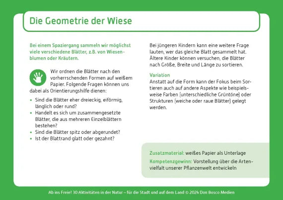 Welche Blumen wachsen auf der Wiese? Ist dieser Baum eine Fichte oder Tanne? Mit welchem Naturmaterial lassen sich tolle Pinsel basteln? Von Frühling bis Winter – zu jeder Jahreszeit gibt es draußen unzählige Dinge zu erleben. Mit diesen Bildkarten sind Sie für einen spannenden Ausflug in die nähere Umgebung gerüstet und wecken das Interesse der Kinder an der Natur. Die abwechslungsreichen Sammelaufträge geben den jeweiligen Aktionsort vor. Ganz gleich, ob ein spontaner Besuch bei den Tieren und Pflanzen auf der Wiese oder geplante Wald-Experimente: Für Kinder ab drei Jahren wird mit diesen Bildkarten die Natur zum Abenteuerspielplatz!