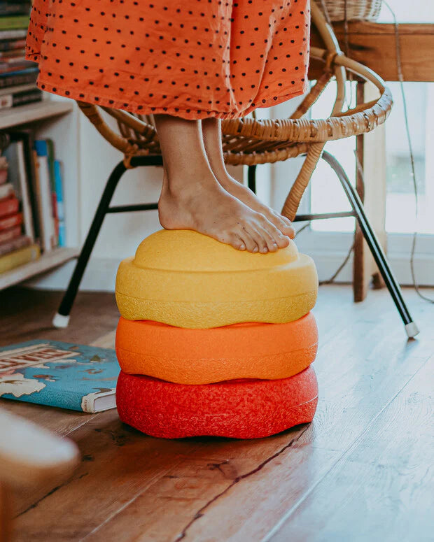 Wenn du die Produkte von Stapelstein® für Balancespiele und für Parcours einsetzen willst, mache das am besten auf einem ebenen und rutschfesten Untergrund. Stapel die Stapelstein® Elemente nur so hoch, wie du dich sicher fühlst. Wir empfehlen dir maximal 3 Elemente zu stapeln, wenn du zu Fuß auf einen Turm steigen möchtest.