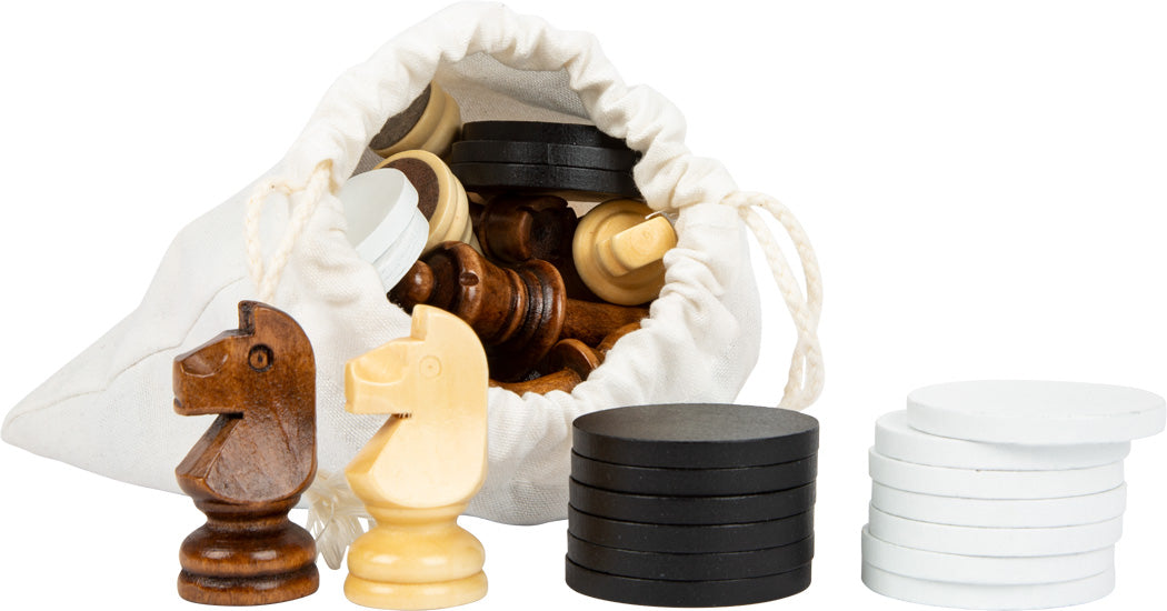 Auf dem großformatigen Spielbrett aus Holz sind beim Schach- oder Dame-Spiel Taktik, Geschick und durchdachte Spielzüge gefragt. Die XL-Spielfiguren machen es Spielern mit kleinen Händen oder unsicherer Handführung einfach, die Spielsteine zu setzen. Mit Stoffbeutel.