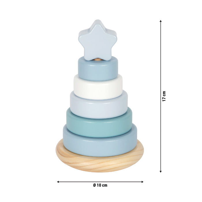 Ein stilvoller Hingucker für kleine Stapelfans! Dieser zauberhafte Stapelturm aus Holz wird von einem Stern gekrönt. Die harmonische Kombination aus zarten Pastelltönen, naturholzfarbenem Element und Weiß macht ihn zu einem besonderen Hingucker im Kinderzimmer. Mit verschiedenen Stapelringen in abgestuften Farbtönen fördert er Feinmotorik, Konzentration und das Erkennen von Größen. Ob als Lernspielzeug oder dekoratives Element – dieser Stapelturm vereint Funktionalität mit Design und ist ein ideales Geschenk zur Geburt oder Taufe. Mit abgerundetem Boden, der den Stapelturm lustig hin und her schaukeln lässt.